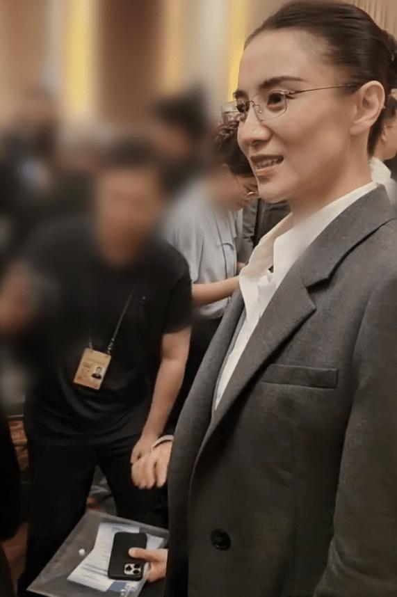 身穿卡其色套装搭配黑框眼镜,长发在脑后扎了个清爽的丸子头,造型优雅又不失时尚感,保持精致的同时也尊重了活动的正向和严肃。