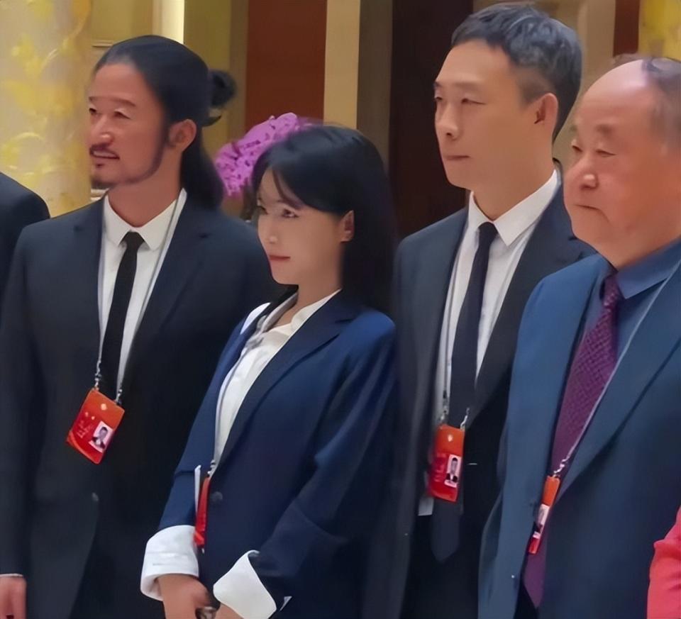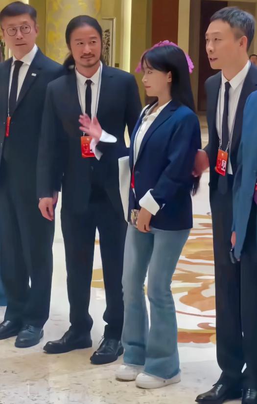她身上的星光不算浓,但气质却相当出众,一身藏蓝色西装站在吴京和张译中间,更衬得她身材娇小。